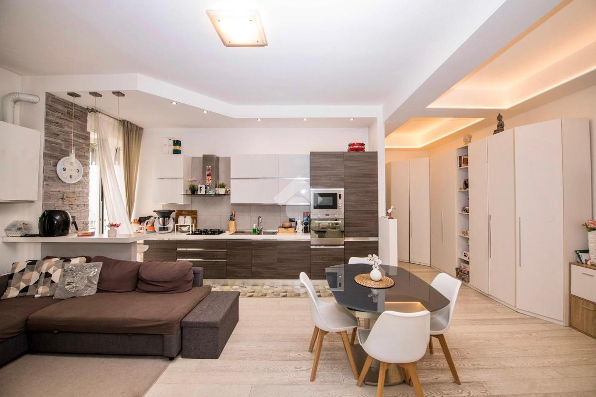 L’ingresso conduce alla zona giorno con soggiorno e cucina a vista, un ambiente accogliente e ben organizzato, valorizzato da una doppia finestra e dall’accesso al balcone con affaccio esterno.